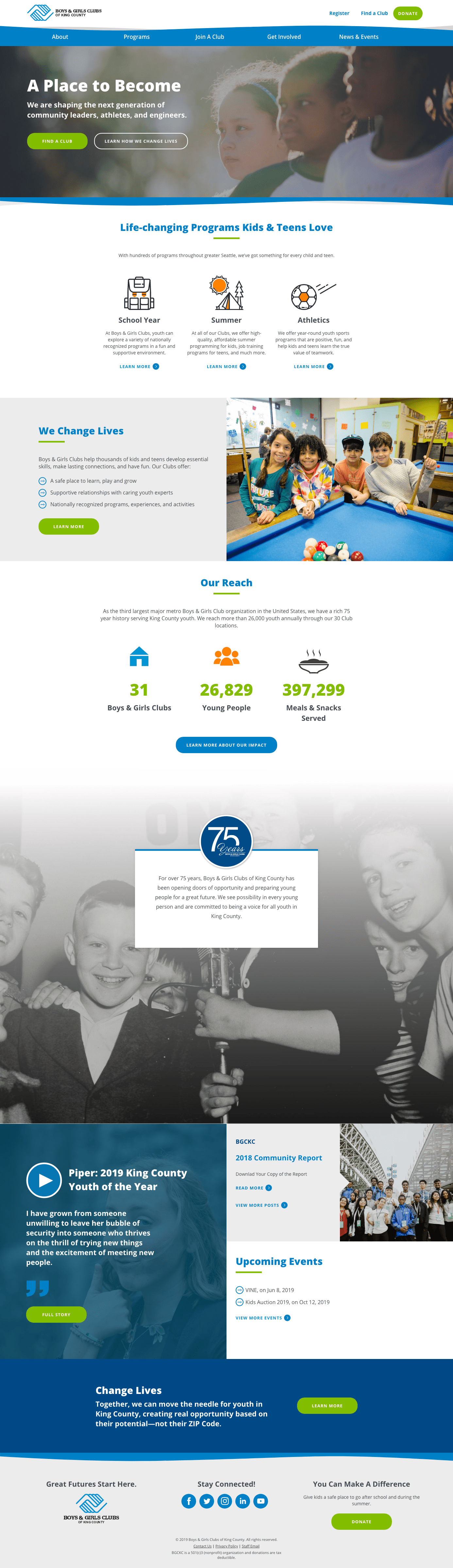 Boys & Girls Clubs of King County (B&G) is basically an after-school program superstar. From sports and arts to STEM and leadership, it empowers kids of all ages to gain experience and friends in any activity. Their problem was that they’re made up of 29 local clubs, and had no central control over their story, the quality of individual websites, or an intuitive user experience. The inconsistent online presence made the clubs seem less like a brand, and more like a random collection of rec centers. That’s where the boys and girls of Sayenko Design come in.